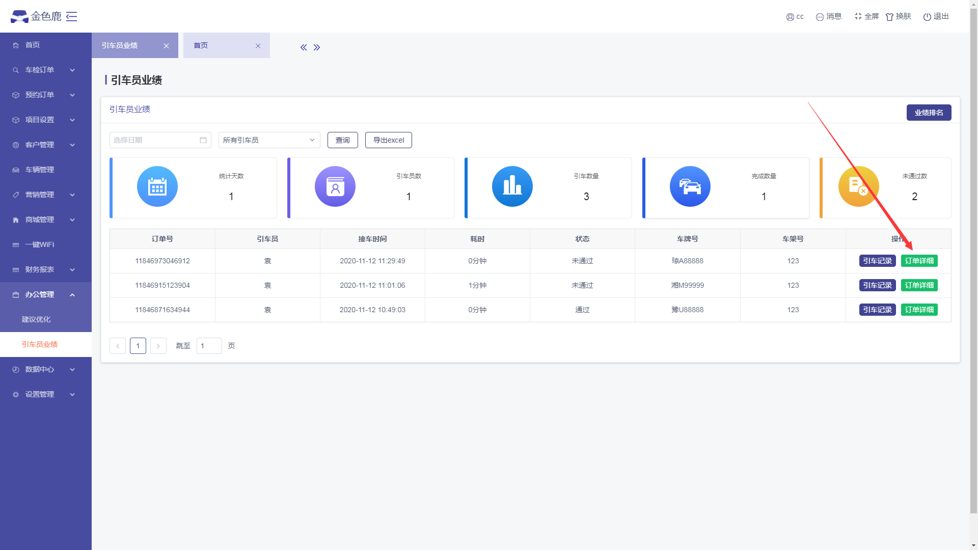 - 进入引车员业绩页面,点击【订单详细】按钮,可以查看引车员的引车订单详情