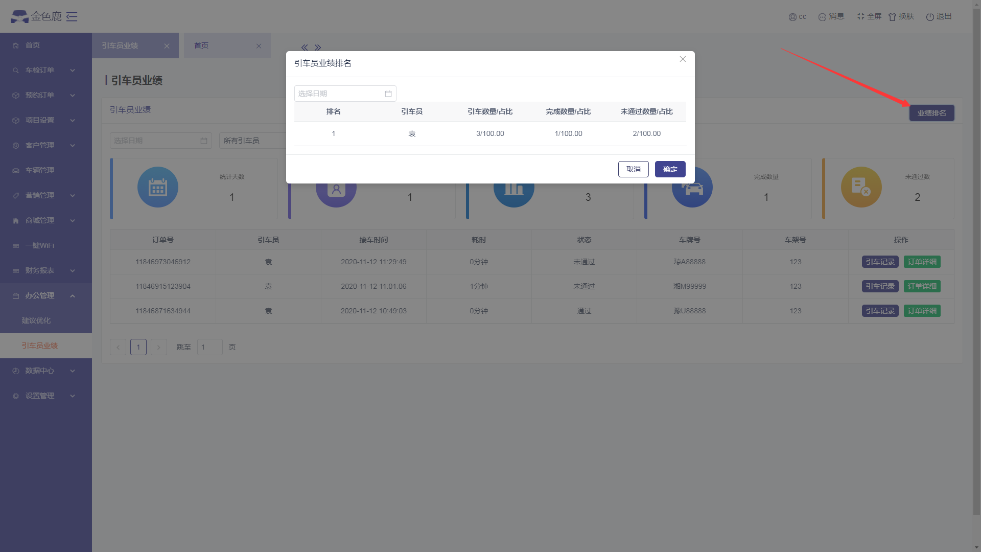 - 进入引车员业绩页面,点击【业绩排名】按钮,可以查看引车员的业绩排名