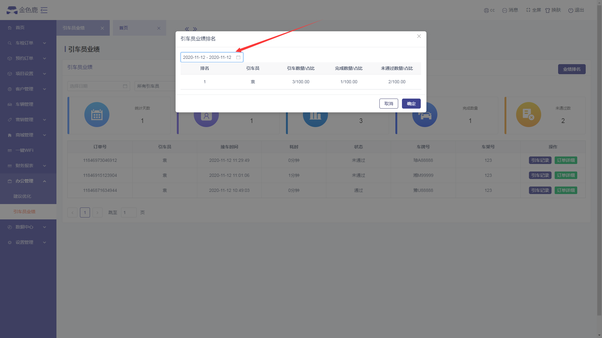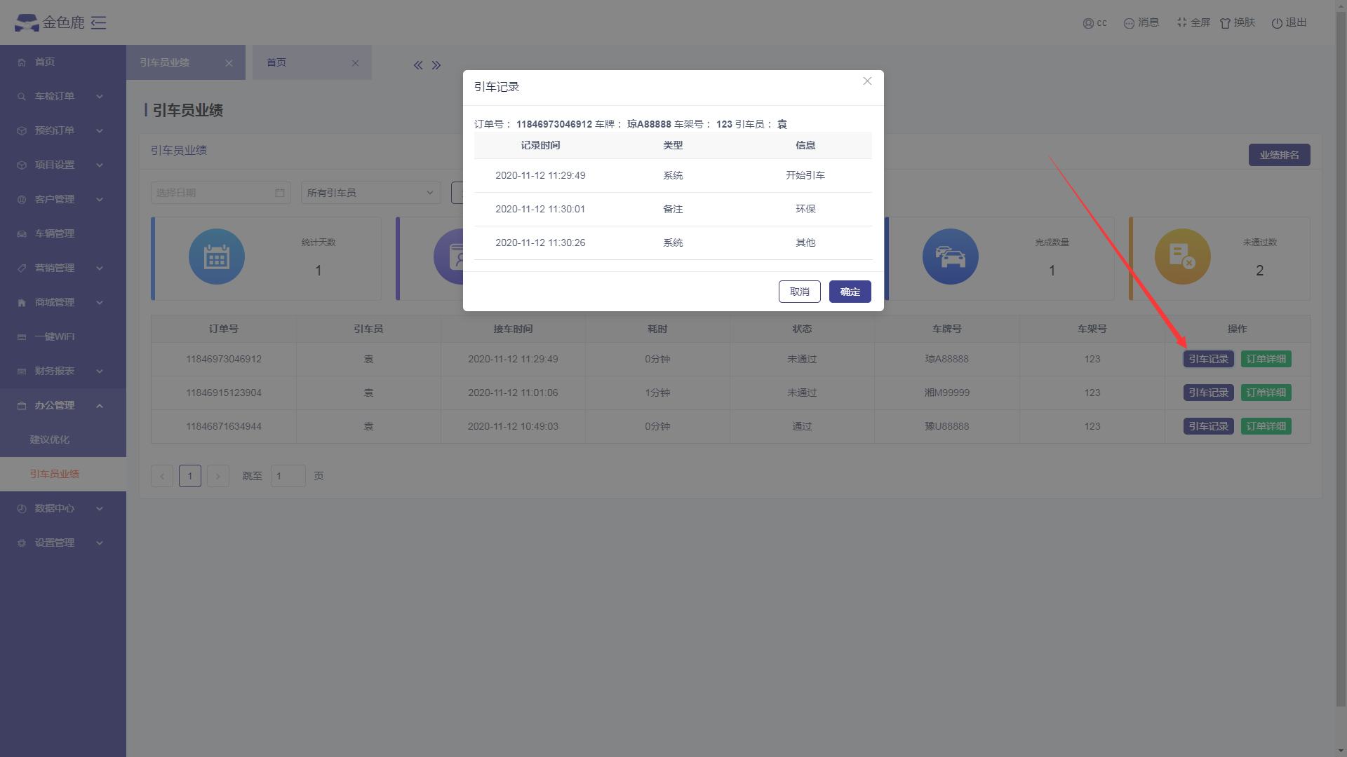 - 进入引车员业绩页面,点击【引车记录】按钮,可以查看引车员的引车记录