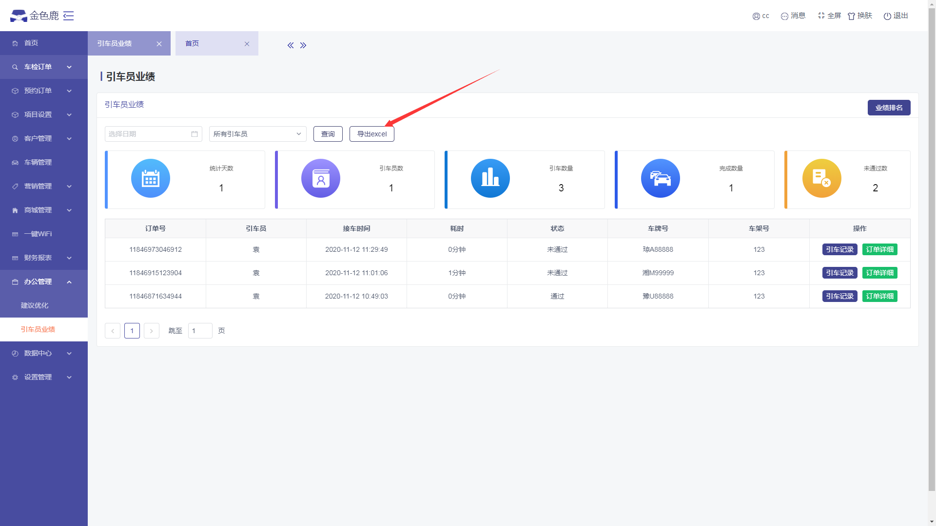 - 进入引车员业绩页面,点击【导出excel】按钮